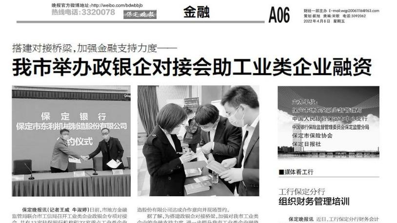 3月31日,受保定市地方金融監(jiān)管局邀請(qǐng),我司參加保定市工業(yè)類企業(yè)政銀企專項(xiàng)對(duì)接會(huì),并進(jìn)行金融服務(wù)宣講及平臺(tái)使用介紹。以下為保定日?qǐng)?bào)客戶端(2022年4月2日)及保定晚報(bào)(2022年4月8日A06版)對(duì)該會(huì)議進(jìn)行的宣傳報(bào)道。